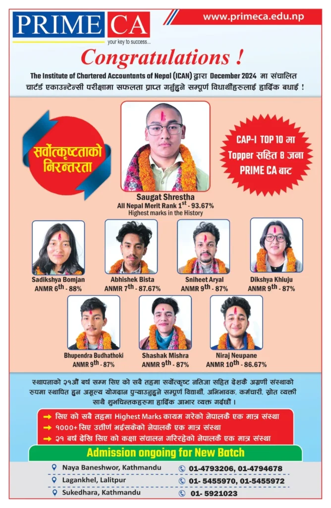 EXCELLENT Based on 196 reviews Posted on Pawan SilwalTrustindex verifies that the original source of the review is Google. I was a Science background student in Plus 2 and then I join Prime CA .Prime CA is an outstanding educational institute that guide me in my CAP I journey and I was able to get Rank 7 in CAP I examination. They have brilliant faculty members, conducts regular tests and exam, provide all essential materials so you will not regret choosing Prime CA as your guide for your CA journey.Posted on Roshan MahatTrustindex verifies that the original source of the review is Google. Good learning environment and a reliable place for CA education.Posted on Sundar DhakalTrustindex verifies that the original source of the review is Google. Excellent place to learn and grow. Supportive staff, good facilities, and a motivating environment. Proud Student of PRIME CA😇Posted on Prashenjit ShakyaTrustindex verifies that the original source of the review is Google. PrimeCA played a key role in my CAP I journey. Its regular classes, tests, supportive mentors, and encouraging team made learning enjoyable, built confidence, and created lasting friendships—truly a rewarding experience.Posted on sidharth sahTrustindex verifies that the original source of the review is Google. Best institute for CA education.Posted on Jeena SubbaTrustindex verifies that the original source of the review is Google. Best institution for CA, both faculties and the management is top notch. 👍Posted on Saugat ShresthaTrustindex verifies that the original source of the review is Google. "Dreams and success, not only the result of hard work but also the outcome of quality guidance and mentorship." My journey to securing ANMR 1 in CAP-I with 93.67% — the highest score ever recorded — feels surreal. It was not just a result of hard work, but also the unwavering support of PRIME CA. From the very first day, PRIME CA stood out with its structured curriculum, expert faculty, and relentless focus on conceptual clarity. The comprehensive study materials, dedicated faculty, personalized doubt-solving support, and rigorous scholarship tests and mock tests were fundamental to my preparation. This milestone stands as a testament to PRIME CA’s excellence in CA education. With self-belief and PRIME CA’s guidance, success isn’t a possibility—it’s an inevitability. Saugat Shrestha All Nepal Rank 1 | CAP-I (93.67%) Proud Student of PRIME CA
