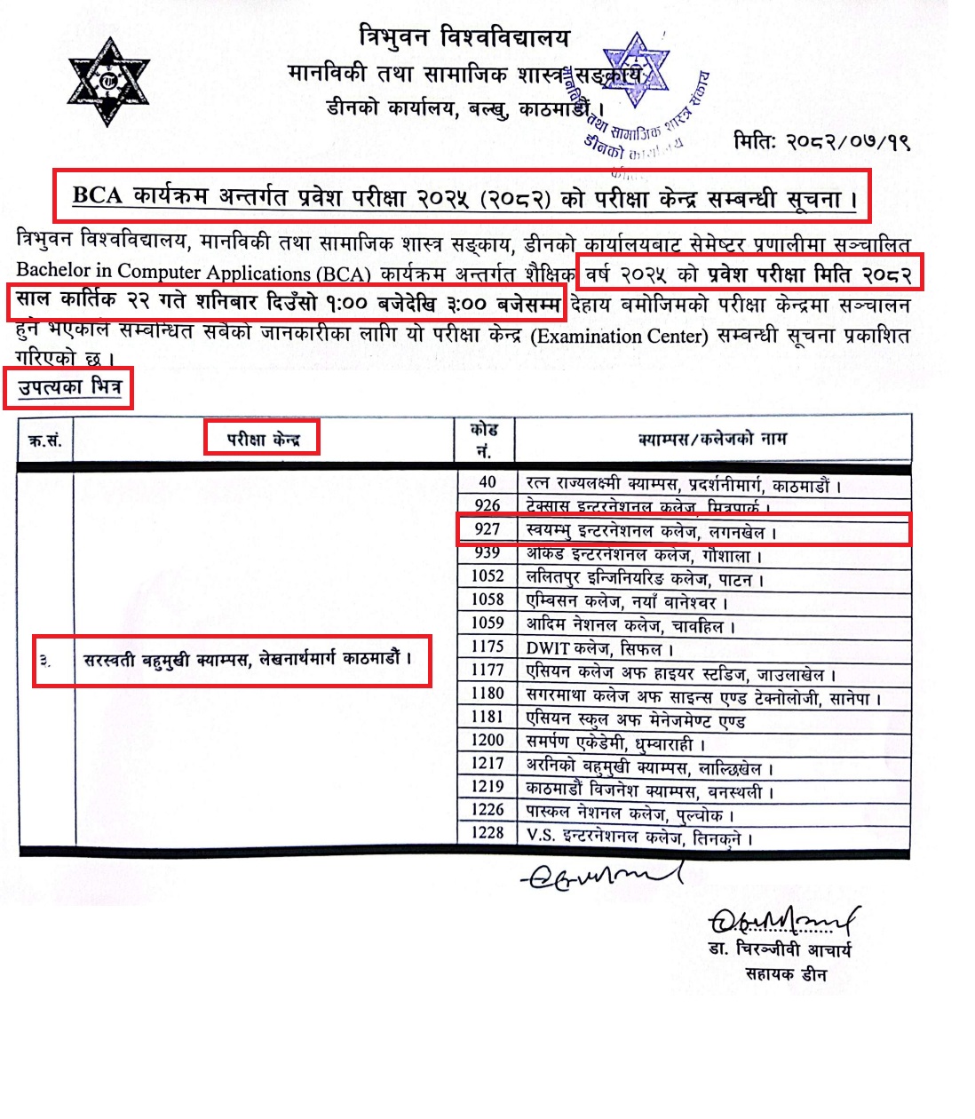 BCA Entrance Exam Center – Notice !!!